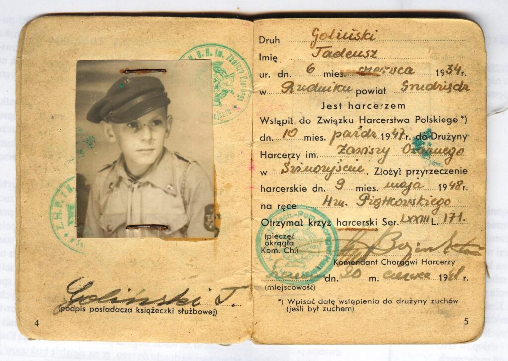 Ale dla nas to przede wszystkim był dh Tadeusz, „Prawdzic”. Gawędziarz, niestrudzony bojownik o prawdziwe harcerstwo. Jako uczeń Szkoły Powszechnej nr 1 (obecnie Szkoły Podstawowej nr 1) zafascynował się harcerstwem, które właśnie powstawało w Świnoujściu. Dołączył do I Męskiej Drużyny Harcerzy im. Zawiszy Czarnego w Świnoujściu (od której wywodzi się obecny III Szczep Harcerski „Słowianie” Związku Harcerstwa Rzeczypospolitej). Drużyna druha Tadeusza w harcerskich działaniach wyraźne nawiązywała do przedwojennej tradycji ZHP, co było solą w oku władz partyjno-administracyjnych. „Gdy zostałem drużynowym, rozmawiałem z tow. hufcowym (tak kazał się tytułować) o przygotowaniu drużyny do przyrzeczenia harcerskiego i tym samym otrzymania krzyży harcerskich. Otrzymałem odpowiedź, że żadnych przyrzeczeń już nie będzie, bo teraz już nie będzie harcerstwa, bo zostało ono przekształcone w pionierów na wzór radziecki. Czyli moje przyrzeczenie z 9. maja 1948 r. w Międzyzdrojach było ostatnim. Zostałem też ostrzeżony, że solą w oku władz partyjnych było to, że chodziliśmy w szyku zwartym do kościoła, braliśmy udział w świętach Bożego Ciała, trzymaliśmy wartę przy grobie Chrystusa. Byliśmy widoczni w mieście, w marszu śpiewaliśmy legionowe pieśni, przed wyjazdem na obóz organizowaliśmy w kościele pw. Gwiazdy Morza mszę harcerską itp. Następnie tow. hufcowy powiedział, że jesteśmy przeciwni zmianom przekształcania harcerstwa w pionierów, zlikwidowaniu krzyży, lilijek i mundurów. Towarzysz hufcowy zaczął oczerniać uwielbianego przez nas drużynowego, określił go, jako wroga Polski Ludowej, że uciekał na zachód i że bezpieczeństwo go załapało w Pradze w Czechosłowacji. Na odprawie komendy hufca 30 kwietnia 1950 r. wszystkich uczestników spotkania tow. hufcowy zaprosił na obiad do restauracji, która była pod biurem komendy hufca, na rogu ul. Hołdu Pruskiego i Piłsudskiego. Był tam też zarząd powiatowy ZMP. Szokiem dla mnie było, który uważałem prawo harcerskie za święte, podanie do obiadu wódki i częstowanie papierosami harcerzy. Następnie wskazano na mnie i nakazano zaprzestania noszenia munduru harcerskiego i zagrożono naganą, jako członkowi ZMP! Nic mnie to nie obeszło, bo to ZMP zapisano mnie siłą. Na następne spotkanie znów przyszedłem w mundurze i wydalono mnie z ZMP, jako wrogi element.” — tak wspominał ten czas dh Goliński.