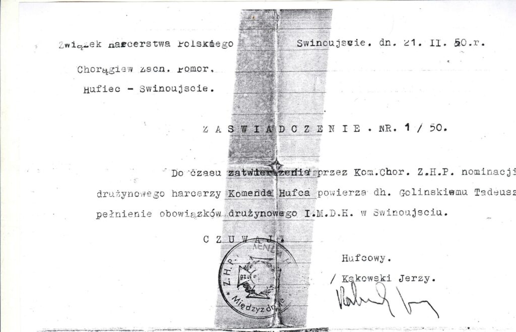 „Gdy dowiedziałem się, że hufcowy w tedy 1950 roku zarządził spalenie pamiątek po dawnym harcerstwie zabrałem i przechowałem proporce zastępów, sztandar jeden z nas bez wiedzy reszty ukrył na strychu szkoły. Przechowałem je do 1990 roku, kiedy przekazałem je do Komendy Hufca ZHP w Świnoujściu ul. Żeromskiego i ślad po nich zaginął”.