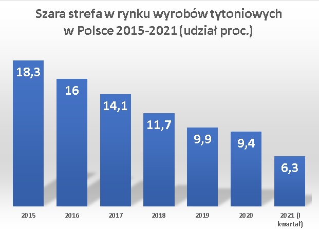 Udział nielegalnego handlu papierosami w polskim rynku tytoniowym maleje sukcesywnie od 2015 r., gdy udział szarej strefy w krajowym rynku tytoniowym przekraczał 18,3 proc. Szacuje się, że każdy procent rynku odzyskany dla legalnej sprzedaży papierosów to ok. 250 mln zł więcej w budżecie państwa. Z raportu Instytutu Almares wynika, że zmalał też rynkowy udział podrabianych wyrobów tytoniowych: z 1,3 proc. w 2020 roku do 0,7 proc. w I kwartale br.