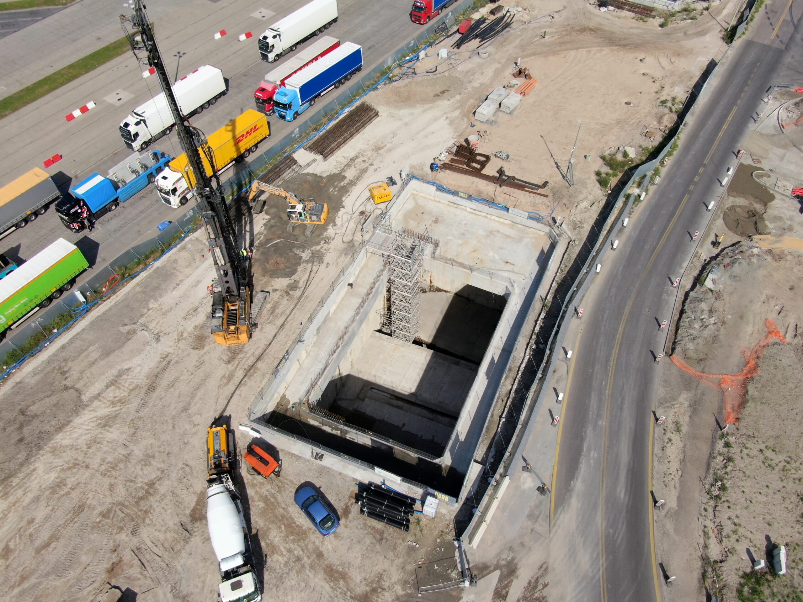 Aktualnie w komorze startowej trwa wiercenie otworów, które umożliwią wklejanie prętów pod wsporniki stropu pośredniego. Aby zamontować wsporniki, wykonywane są także bruzdy w ścianach szczelinowych.