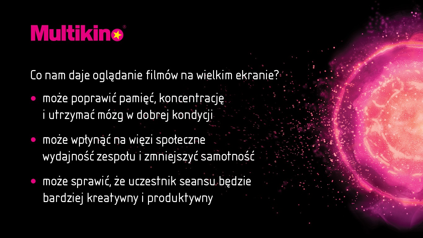 Doświadczenia kulturowe, takie jak kino, mogą poprawić pamięć, koncentrację i utrzymać mózg w dobrej kondycji. Podczas seansu serca biją zgodnie, co może wpłynąć na więzi społeczne, wydajność zespołu i zmniejszyć samotność. Kilka godzin w kinie może sprawić, że uczestnik seansu będzie bardziej kreatywny i produktywny.