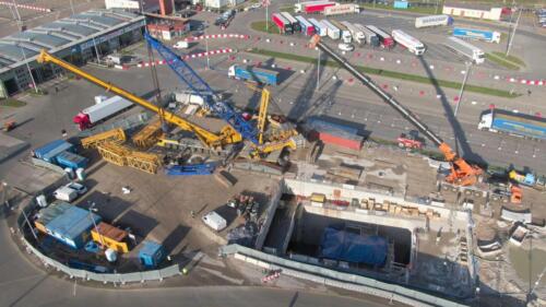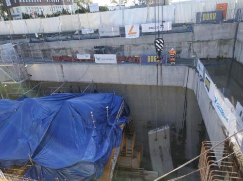 – Aby wykonać wykop przewidziano metodę zamrażania gruntu. Ma to zminimalizować ryzyko niestabilności wykopu i zalania wodami gruntowymi. Zamrażanie przeprowadza się przez przepuszczanie płynu chłodzącego przez system rur. Schładzany do minus 35 stopni Celsjusza roztwór solanki będzie krążył w zamkniętym systemie rur i przenosił ciepło z gruntu do instalacji, a następnie do atmosfery. Średnia temperatura zamrożonej bryły gruntu dla piasków i gliny to minus 10 stopni, a dla kredy minus 8 – mówi Jacek Król, Inżynier Rezydent z konsorcjum SWECO/Lafrentz, które prowadzi nadzór nad tą inwestycją. – Właśnie trwają przygotowania do montażu systemu rur, którym popłynie solanka.