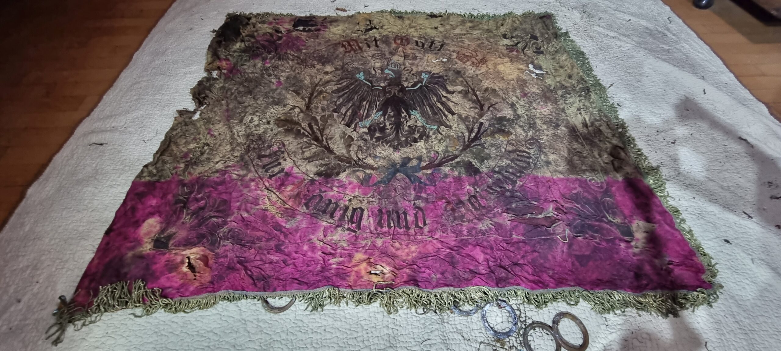 Wiadro zostało odnaleziono niedaleko drzewa. Było zakopane bardzo płytko. Przedmiot przebywał w ziemi blisko 80 lat. Wewnątrz ukryto niemiecki sztandar. Mógł należeć do wojska lub jakiegoś stowarzyszenia.