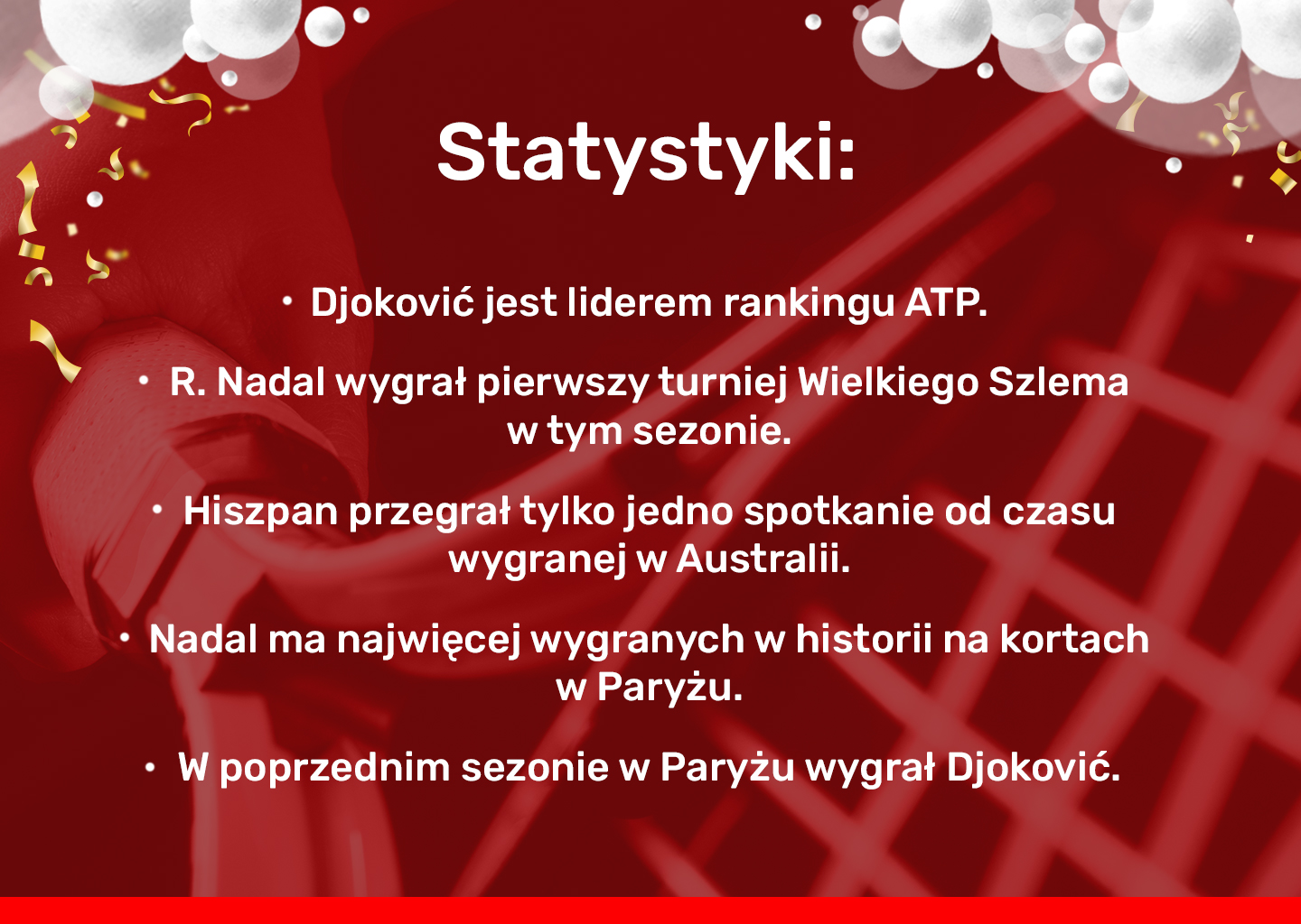 Ciekawostka dotycząca Rafaela Nadala w tym sezonie jest taka, że wygrał on wszystkie spotkania, które rozegrał 2022 roku, oprócz finału turnieju w Indian Wells. Właśnie wtedy musiał uznać wyższość T. Fritza, jednak jak sam przyznał na konferencji prasowej – zmagał się z poważną kontuzją żeber. Rafa gra jednak w 2022 roku zdecydowanie lepiej, niż spodziewali się tego eksperci, czy też analitycy zakładów bukmacherskich na tenis. Najgorszym wynikiem Hiszpana był finał w Indian Wells, a jeśli tak dobrze prezentował się na hardzie, to przy powrocie do formy fizycznej, aż strach myśleć, jak mocny może być w Paryżu.