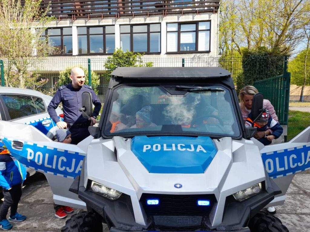 Wizyta przedszkolaków rozpoczęła się od prezentacji policyjnych radiowozów oraz motocykla. Dzieci mogły usiąść za kierownicą radiowozu i sprawdzić, w jaki sposób działa megafon.