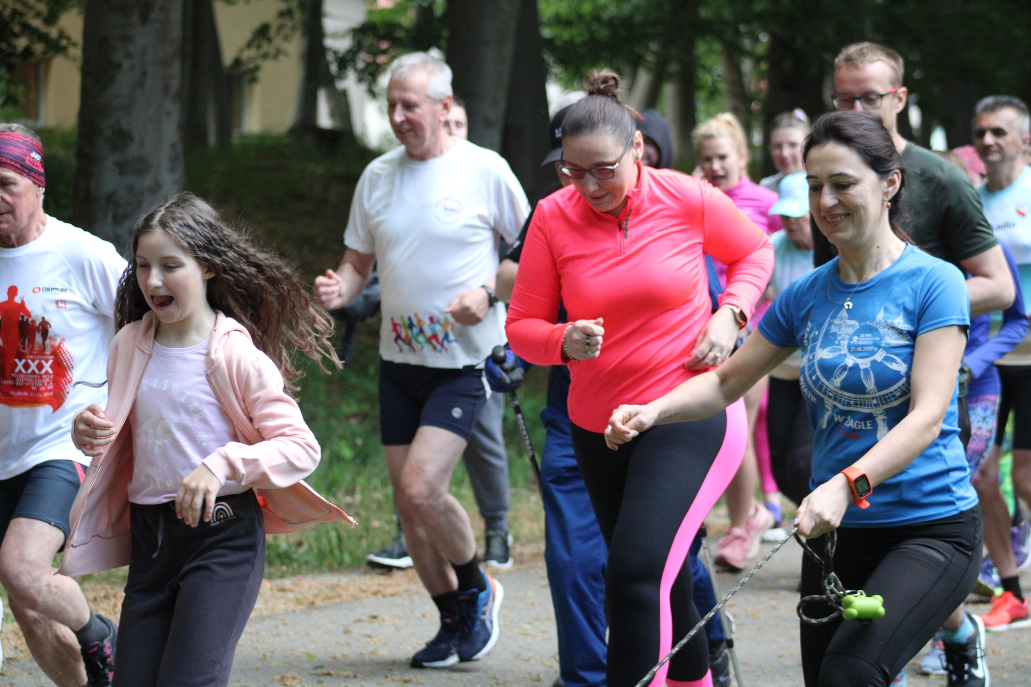 Zmienne warunki atmosferyczne, silny wiatr, chmury i co jakiś czas pojawiające się słońce przywitały sobotniego poranka, grupę miłośników aktywnego spędzania czasu. O godzinie 9.00 rano 45 osób ruszyło na trasę 5 km, która jak zwykle biegła ścieżkami Parku Zdrojowego otoczonego piękną wiosenną zielenią, która w jeszcze większym stopniu pojawiła się na drzewach i krzewach.