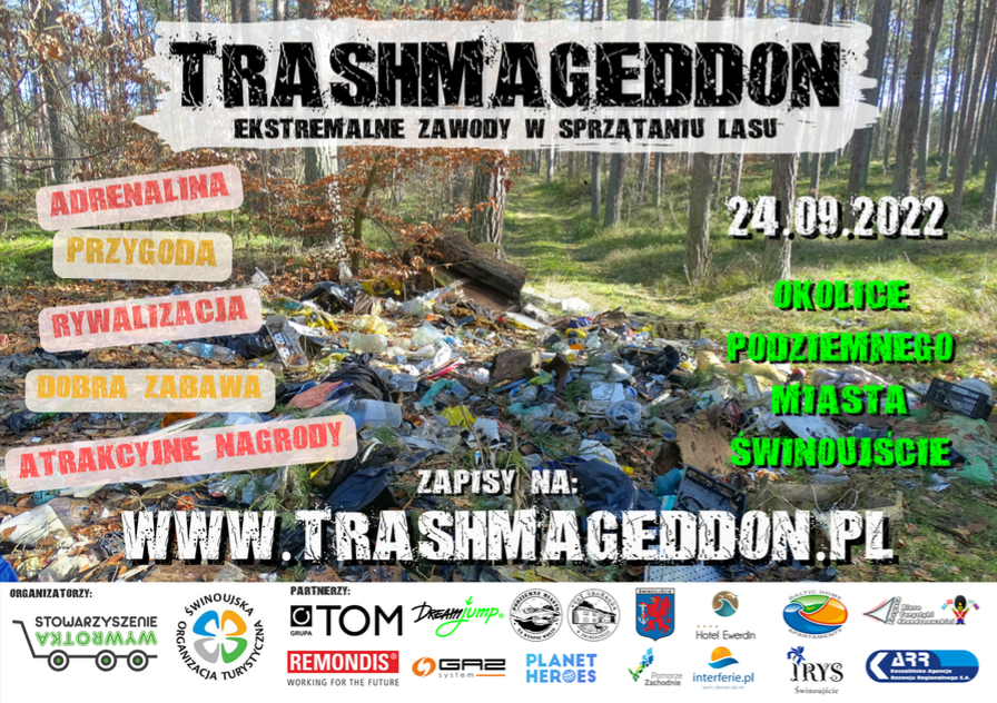 Trashmageddon jest autorskim projektem Stowarzyszenia Wywrotka ze Szczecina, który odbywa się cyklicznie od 2020 r. i z każdą kolejną edycją zdobywa kolejnych sympatyków. Wszystko dzięki unikatowej formule zawodów łączącej w sobie sporty biegowe, siłowe i wytrzymałościowe ze sprzątaniem trudnodostępnych terenów leśnych. Uczestnicy ubiegłorocznej edycji, która odbyła się w szczecińskiej Puszczy Bukowej, wyśrubowali niechlubny rekord ponad 4 ton zebranych śmieci. Czy rekord ten uda się pobić w Świnoujściu? Są na to szanse.