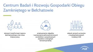 „Centrum GOZ to kolejny realizowany przez nas element transformacji regionu bełchatowskiego. W zeszłym roku otworzyliśmy Centrum Rozwoju Kompetencji, które jest wsparciem dla pracowników sektora węglowego w nabyciu nowych kompetencji. Dzięki powstałemu Centrum GOZ stworzymy nowe miejsca pracy i kolejne możliwości rozwoju dla naszych pracowników. Jestem przekonany, że unikalny na skalę krajową ośrodek, przyciągnie do Bełchatowa wielu specjalistów, i odegra istotną rolę w jego rozwoju – mówi Wojciech Dąbrowski, prezes zarządu PGE Polskiej Grupy Energetycznej. – Rola Gospodarki Obiegu Zamkniętego stale rośnie. W Grupie PGE powołaliśmy specjalny segment realizujący zadania z zakresu zamykania obiegu surowców a Centrum GOZ wpisuje się w założenia naszej strategii osiągnięcia neutralności klimatycznej do 2050 roku” – dodaje Wojciech Dąbrowski.