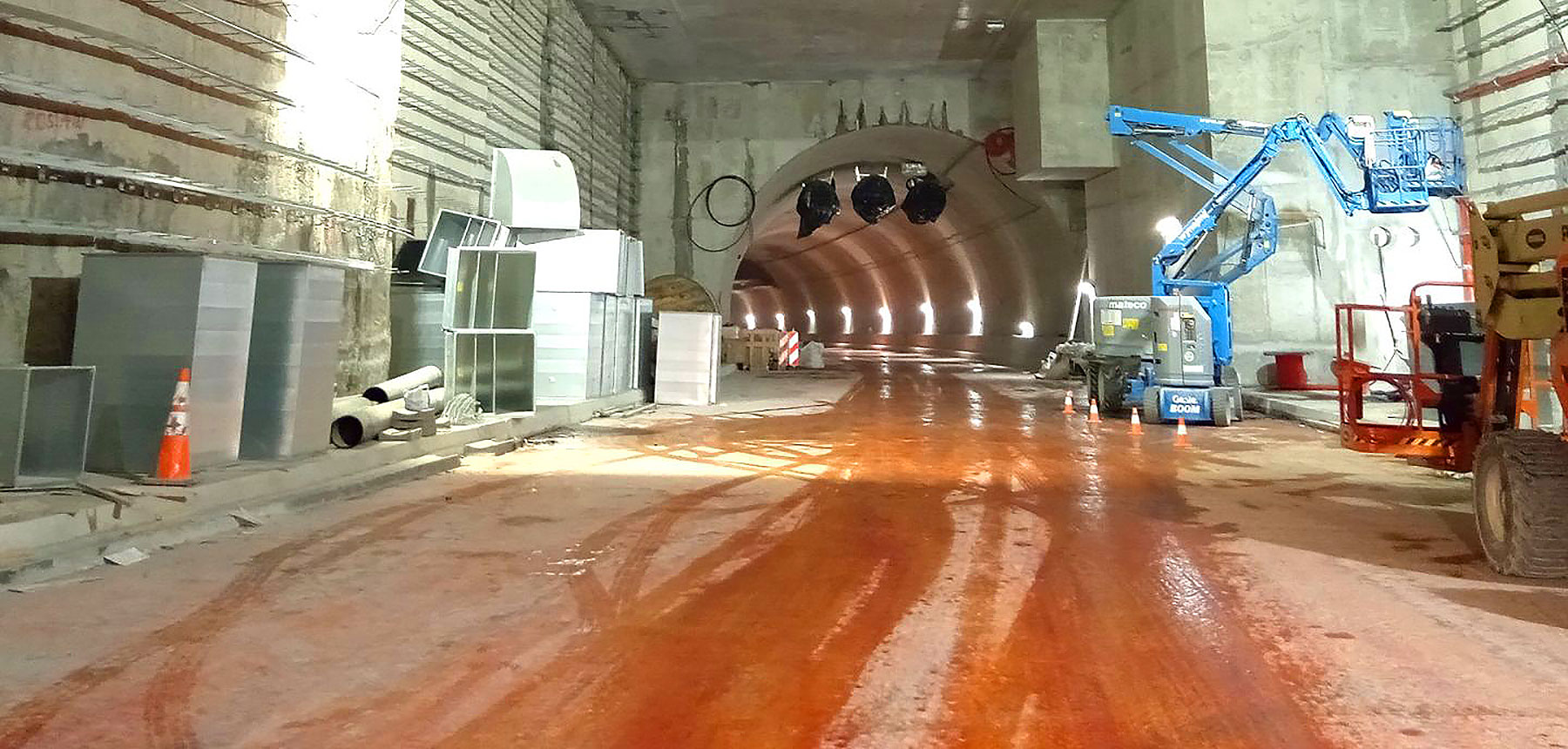 W tunelu będą kontynuowane prace przy kosmetyce powierzchni betonowych i jej doszczelnienie.