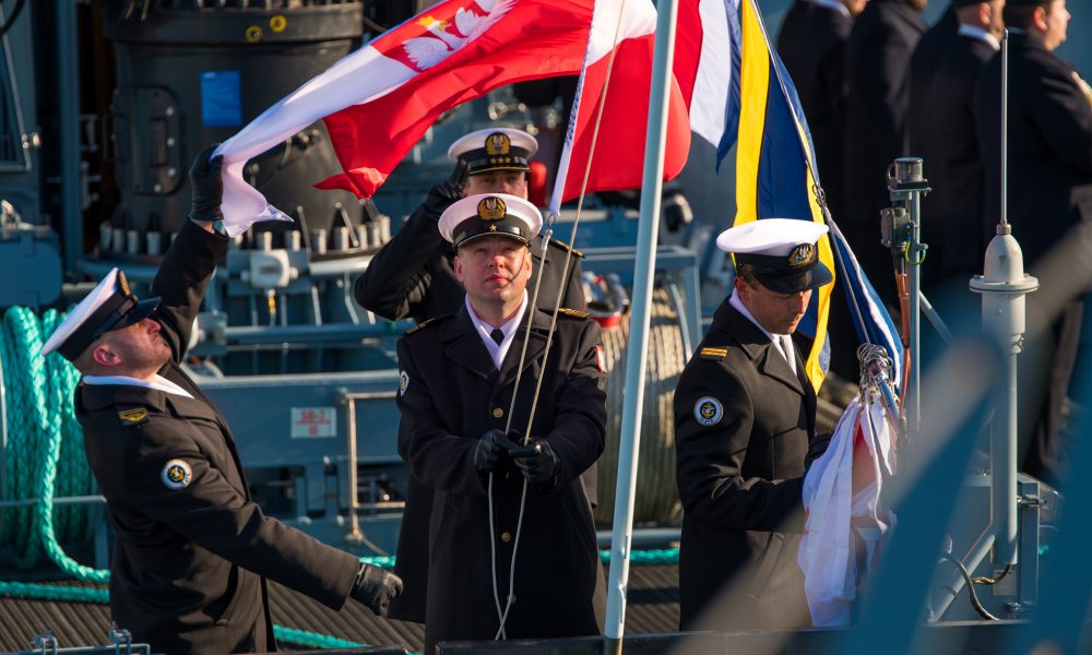 Uroczystość swoją obecnością zaszczycili licznie zgromadzeni goście, w tym najwyższe władze wojskowe w osobach Dowódcy Generalnego Rodzajów Sił Zbrojnych generała broni Wiesława Kukuły oraz Inspektora Marynarki Wojennej wiceadmirała Jarosława Ziemiańskiego, a także parlamentarzyści, samorządowcy, władze regionu i przedstawiciele przemysłu stoczniowego. W trakcie uroczystości Jacek Siewiera, Sekretarz Stanu – Szef Biura Bezpieczeństwa Narodowego przekazał banderę wojenną pierwszemu dowódcy okrętu komandorowi podporucznikowi Bartoszowi Blaszke.
