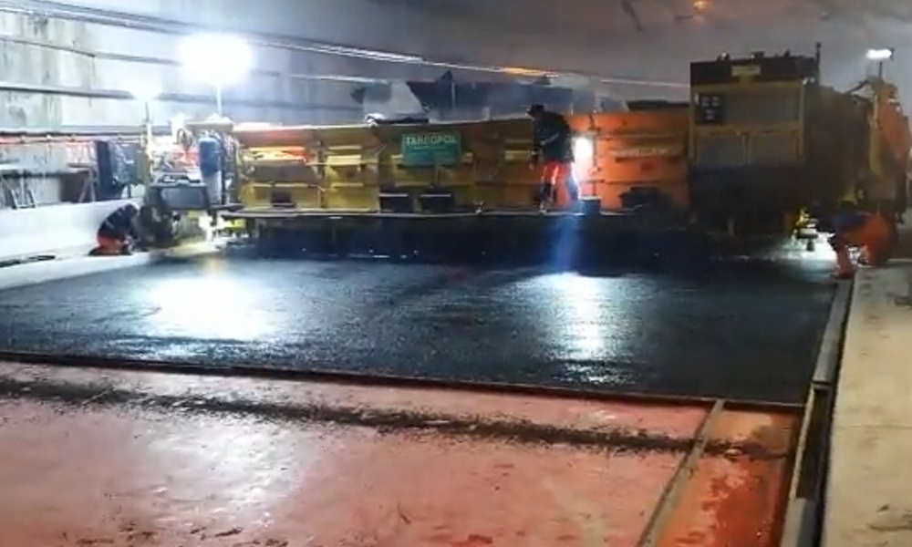 W tunelu wylewają warstwę asfaltu. Zobacz film