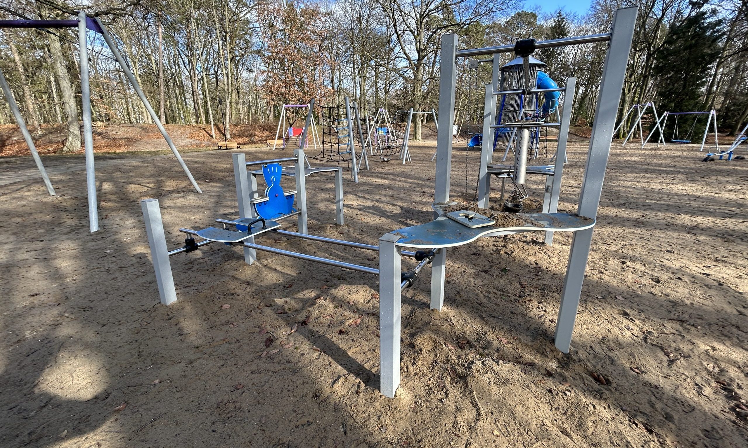 Znajdziemy w nim domek ze zjeżdżalnią, kolorową papugę, zabawki do wspinaczki, tradycyjne huśtawki. Wszystkie instalacje do zabawy wykonane są z drewna, a podłoże jest piaszczyste.