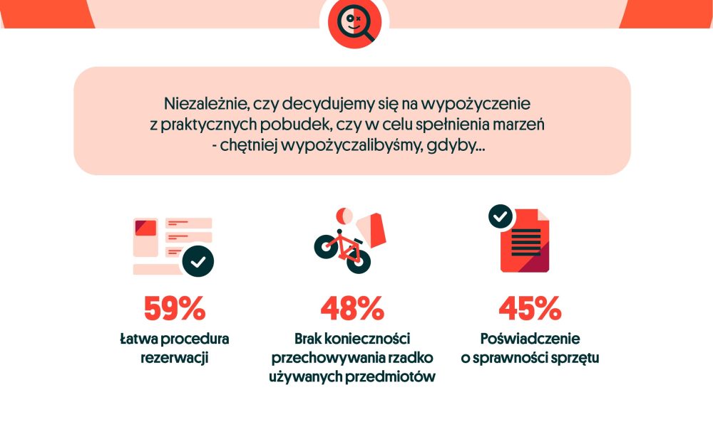 Dla 7 na 10 uczestników badania Danae na zlecenie OLX „wypożyczalnie” to chęć zaoszczędzenia. Rozwiązanie to pozwala na korzystanie z danych urządzeń bez ponoszenia dużych wydatków. 43% respondentów wskazało również to, że korzyścią wypożyczonego sprzętu jest brak kosztów jego utrzymywania i drogich napraw. Co więcej, nie tylko kwestia finansowa jest dla nas istotna. Łatwa procedura, polegająca np. na rezerwacji online, przekonałaby do wypożyczania aż 59% badanych.