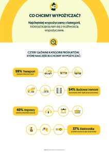 Coraz większą popularnością cieszy się na przykład wynajem kampera, dzięki któremu można wyruszyć w niezapomnianą podróż. Potwierdzają to wyniki badania: aż 70% kojarzy usługę wypożyczania z kategorią transport i 59% skłonnych jest wypożyczać sprzęt właśnie z tej kategorii.
