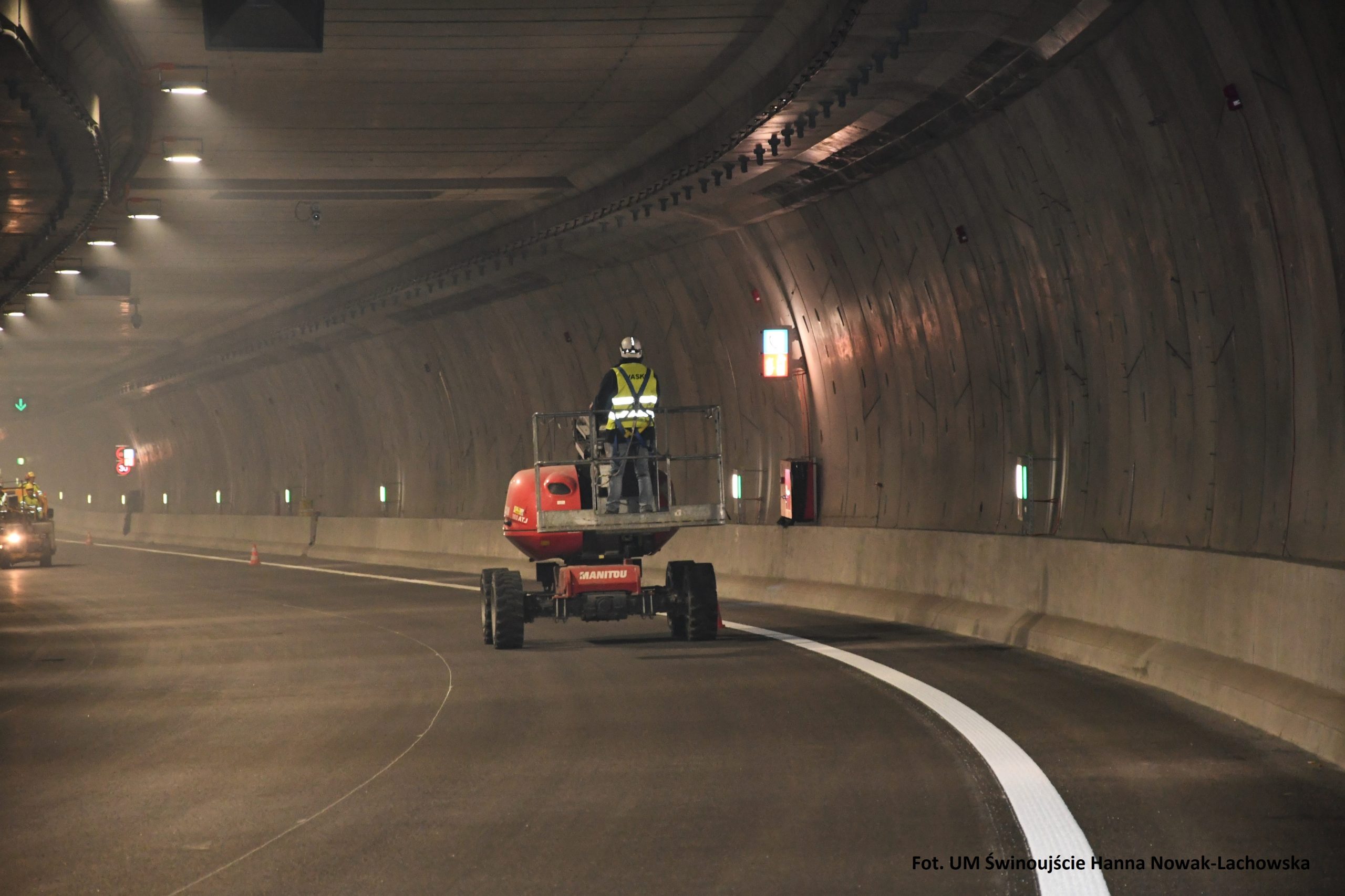 Tunel. Specjalne oznakowanie poziome jest nakładane na warstwę asfaltu