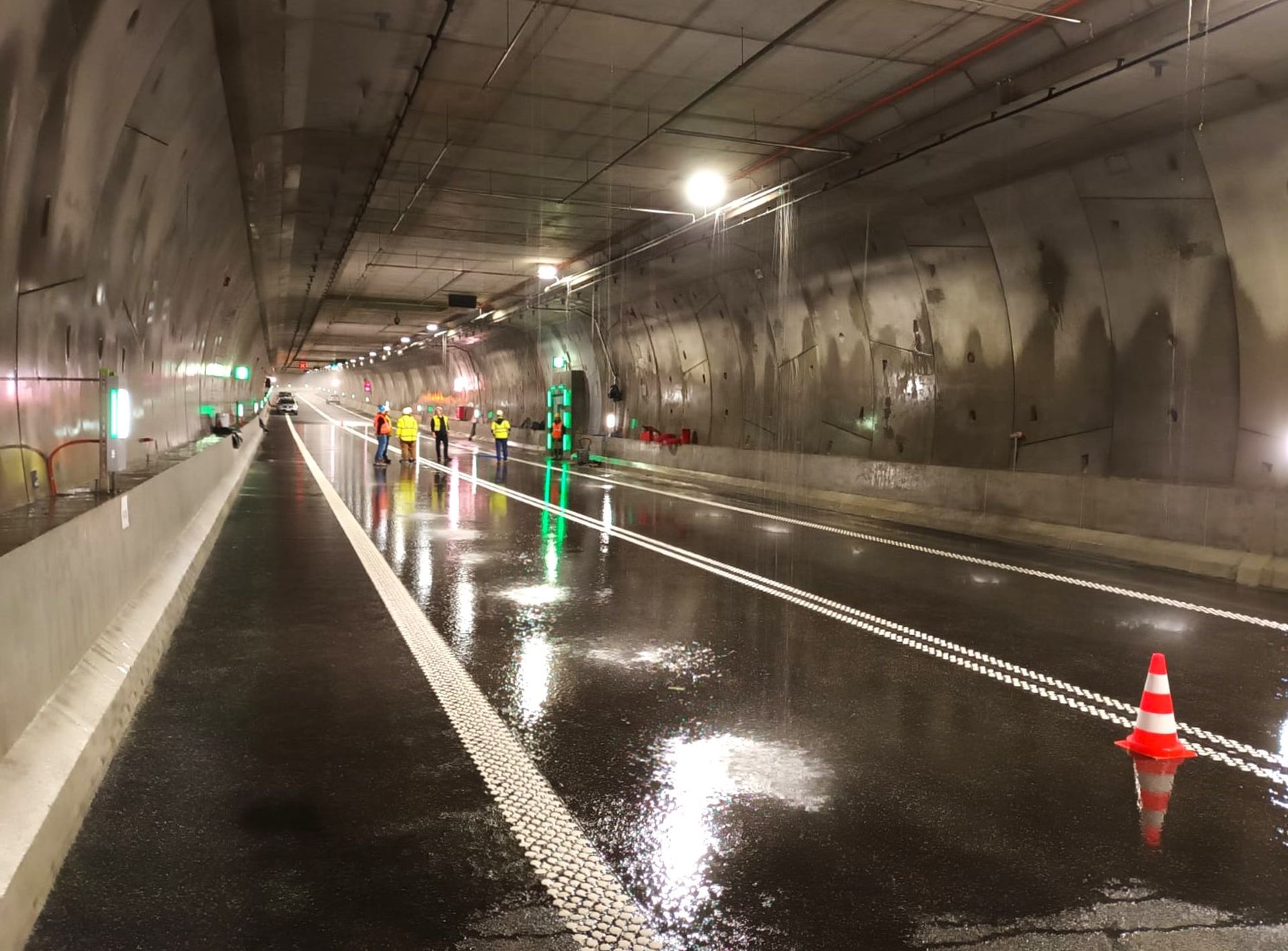 W tunelu testowano zraszacze. Wykonano oznakowanie poziome