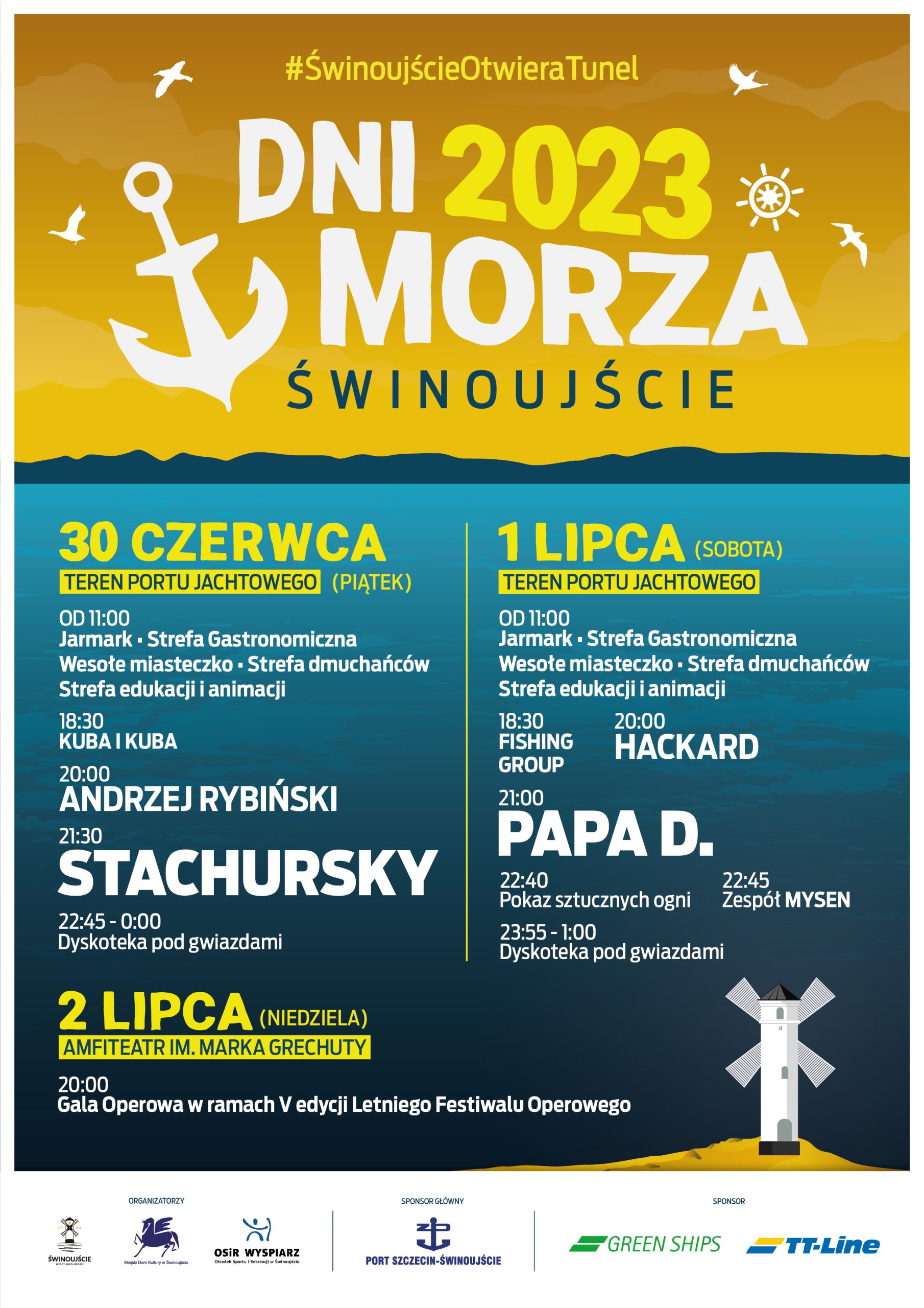 Dni Morza odbywają się na terenie Portu Jachtowego im. Jerzego Porębskiego, gdzie na scenie do późnych godzin wieczornych będą odbywały się koncerty znanych artystów i wykonawców muzycznych. W tym roku głównymi wykonawcami będą Jacek Stachursky oraz Papa D. W piątek oraz w sobotę już od godziny 11:00 będą dodatkowo czekać na nas jarmark, strefa gastronomiczna, wesołe miasteczko oraz strefa edukacji i animacji. Za to w niedzielę 2 lipca, o godz. 20:00 serdecznie zapraszamy do Amfiteatru im. Marka Grechuty na Galę Operową w ramach V edycji Letniego Festiwalu Operowego.