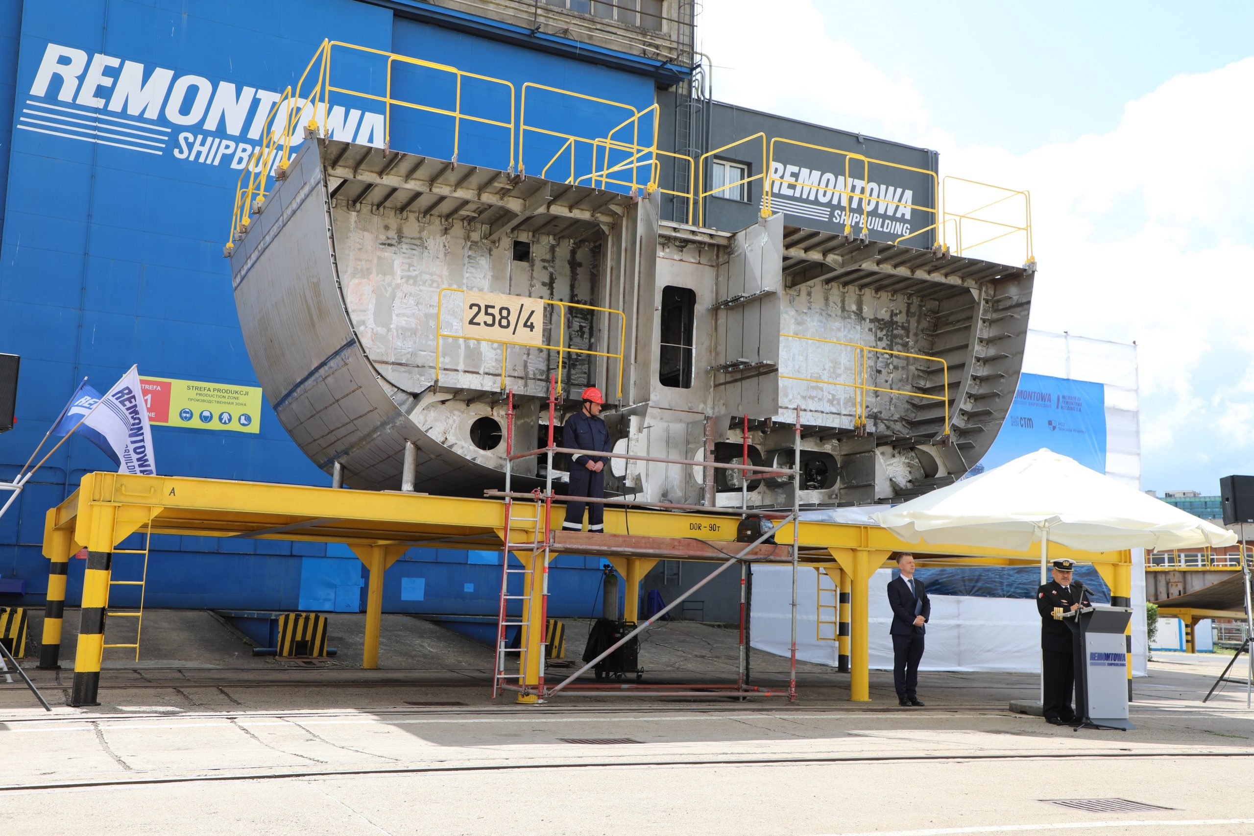 Położenie stępki okrętu proj. B 258/4 budowanego dla Marynarki Wojennej RP jest istotnym elementem procesu budowy okrętu, wieńczącym zakończenie etapu prefabrykacji wstępnej kadłuba, od którego rozpoczyna się montaż poszczególnych elementów jednostki pływającej w całość. W odróżnieniu od inicjującego budowę okrętu tzw. symbolicznego palenia blach, które miało miejsce 28 marca bieżącego roku, dzień położenia stępki jest ważnym dniem odniesienia zarówno dla towarzystw klasyfikacyjnych jak i dla Marynarki Wojennej.