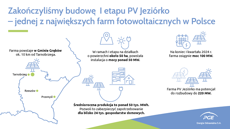 PGE zakończyła na Podkarpaciu budowę I etapu jednej z największych w Polsce farm fotowoltaicznych – PV Jeziórko. Na działkach o powierzchni około 50 ha powstała instalacja o mocy ponad 50 MW. Na koniec pierwszego kwartału 2024 roku farma osiągnie moc 100 MW, a docelowo zostanie rozbudowana do ok. 220 MW.