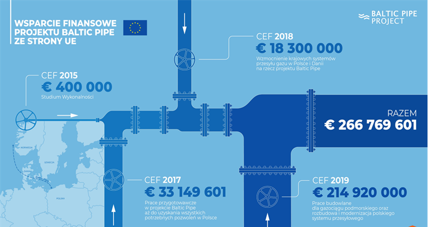 Wartość dofinansowania dla prac budowlanych projektu Baltic Pipe wyniosła 214 920 000 EUR i był to jeden z najwyższych grantów przyznanych w ramach całego programu CEF Energy w ostatniej dekadzie.