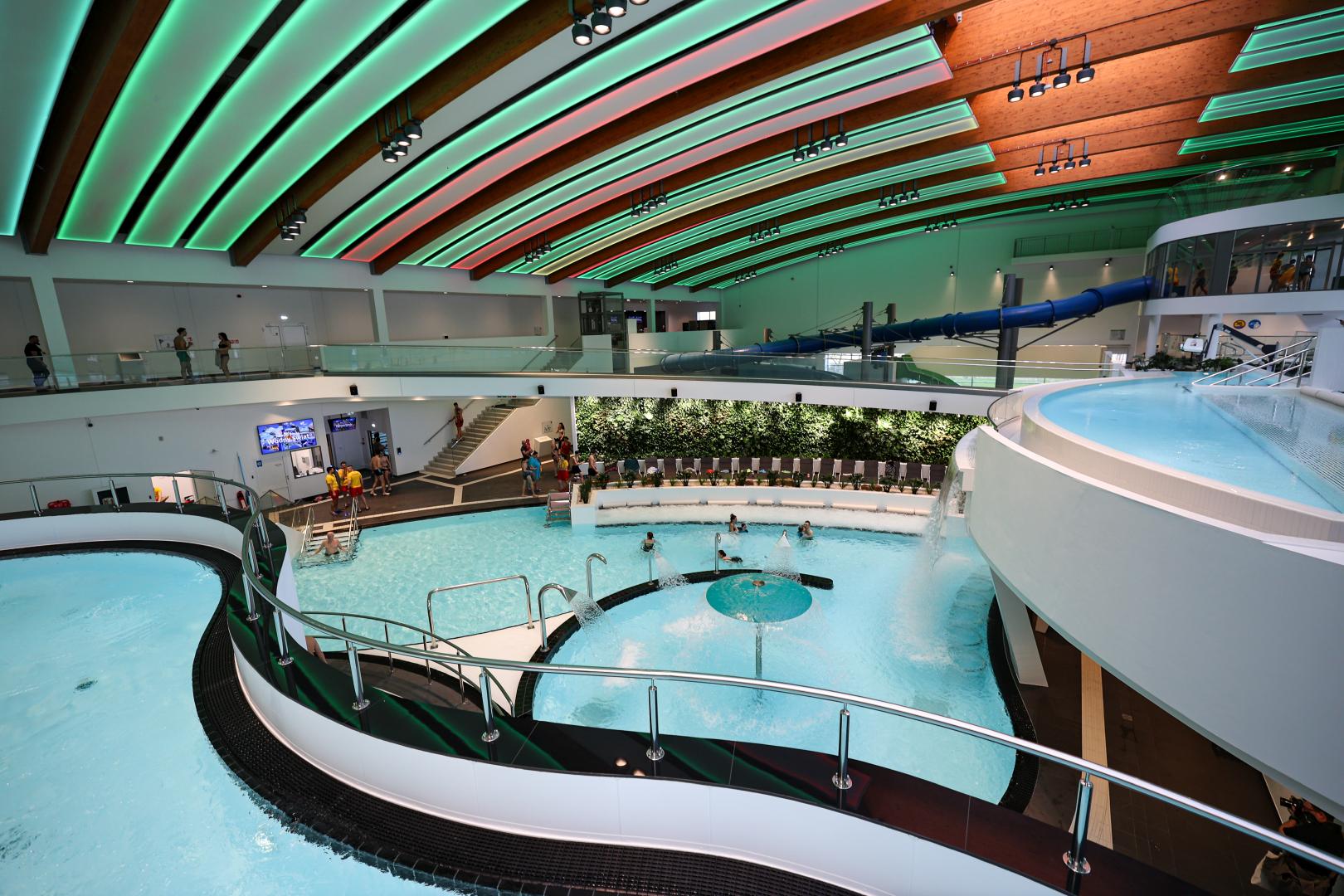 Wewnętrzna cześć Aquaparku to przede wszystkim główna hala basenowa, której centralnym elementem jest basen rekreacyjny. Jest on podzielony na trzy części i można tam wypocząć na wodnych leżankach, wymasować sobie barki przebywając pod wodospadem, skorzystać z siatek do wspinaczki lub zagrać w siatkówkę. Dostępne będą także baseny infinity, rwąca rzeka, basen wypływowy i jaskinie multimedialne. Nie zabraknie wanien spa i jacuzzi. W strefie Royal Tropic wodny bar oraz basen z ekranem. Na sportowych zapaleńców czekać będzie 25 metrowy i 6 torowy basen sportowy. Najmłodsi również znajdą coś dla siebie. Wodny plac z zabawkami tryskającymi wodą z każdej strony, brodzki i zjeżdżalnie dla bardzo małych dzieci, oraz basen z dmuchańcami. W strefie zewnętrznej będzie można popływać w basenie rekreacyjnym. Najmłodsi będą mieli do dyspozycji wodny plac zabaw oraz edukacyjny plac zabaw. Będzie się można poopalać na plaży oraz pograć w piłkę na boisku z nawierzchnią piaskową.