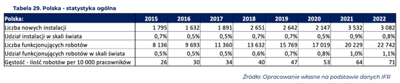 Polska jest 18. na świecie rynkiem pod względem liczby zainstalowanych i pracujących robotów przemysłowych. W Europie zajmujemy 7. miejsce, z prawie 23 tys. zainstalowanych urządzeń. Mimo że w ostatnich latach ich liczba dynamicznie rośnie, nadal jest to zaledwie 10% tego, czym może pochwalić się europejski lider, tzn. Niemcy. Poziom robotyzacji w Polsce można nadal uznać za niski, a nasz rynek za rozwijający się.