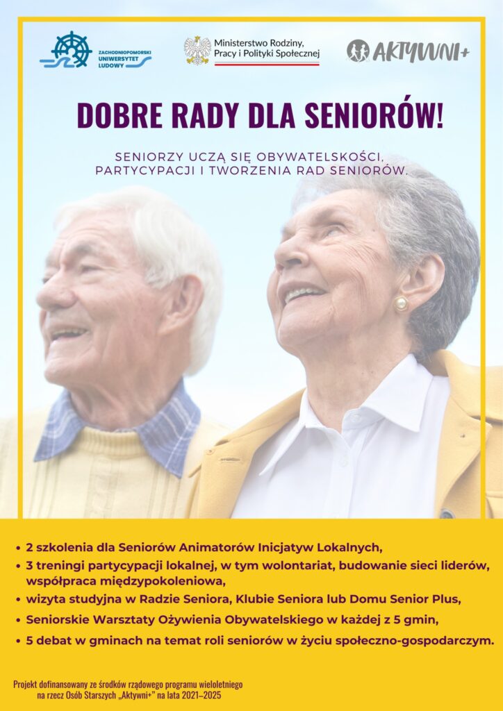 Seniorzy ze Świnoujścia zostali zaproszeni do udziału w projekcie „Dobre Rady dla Seniorów”. Fundacja Speak Up oraz Zachodniopomorski Uniwersytet Ludowy zapraszają seniorów ze Świnoujścia do udziału w nowym, inspirującym projekcie „Dobre Rady dla Seniorów”. Projekt ten ma na celu rozwijanie obywatelskiej aktywności wśród seniorów, zachęcanie do zaangażowania społecznego oraz wspieranie tworzenia rad senioralnych w gminach województwa zachodniopomorskiego.