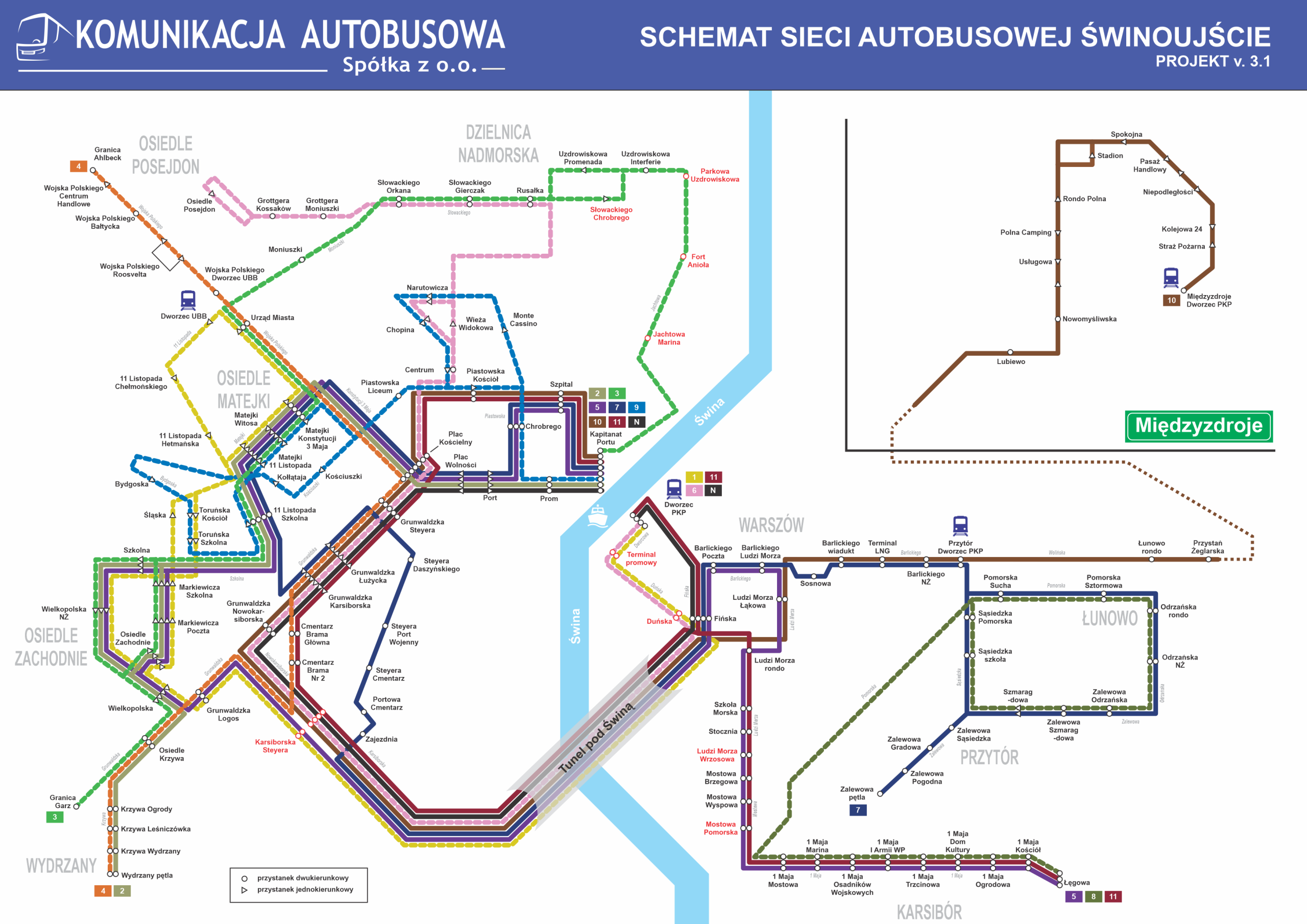- Linia 3: Granica Garz – Os. Zachodnie – Os. Matejki – Dzielnica Nadmorska – Marina – Kapitanat Portu