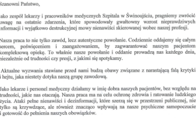 Do redakcji portalu swinoujskie.info przesłano list otwarty podpisany przez pracowników Świnoujskiego szpitala. Treść listu publikujemy poniżej. Szanowni Państwo, jako zespół lekarzy i pracowników medycznych Szpitala w...
